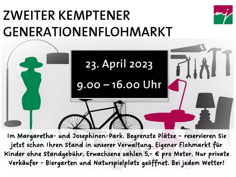 Dank der positiven Resonanz im Herbst geht der Kemptener Generationenflohmarkt in die zweite Runde. 'Von allen Generationen, für alle Generationen' lautet auch diesmal das Motto, wenn der Verkauf am 23. April 2023 ab 9.00 Uhr im Margaretha- und Josephinen-Park beginnt.