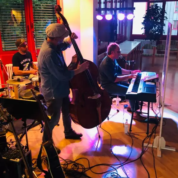 Bassist Christian Hof hatte den Geschäftsführer des Margaretha- und Josephinen-Stift Daniel Huck davon überzeugt, dass im Saal seines Hauses eine geschlossene Veranstaltung für interessierte Mitglieder der Kemptener Lions-Clubs nach Corona-Richtlinien möglich wäre. Anhand einer Gästeliste für fünfzig Personen konnte ein exakter Sitzplan mit gruppierter Bestuhlung unter Einhaltung der Abstandsregeln erstellt werden.