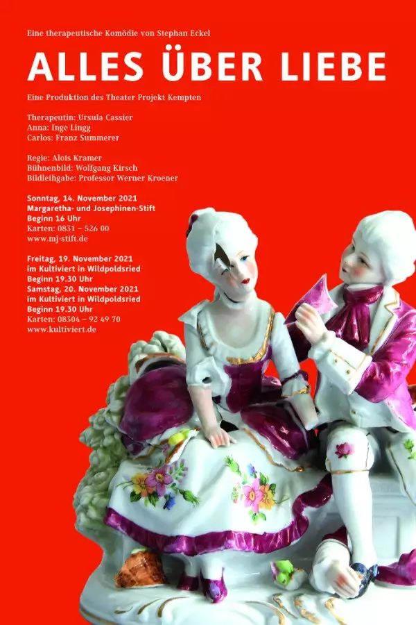 Am Sonntag, 14. November 2021, feiert das Theater Projekt Kempten mit der Komödie 'Alles über Liebe' in unserem Margaretha-Saal Premiere. Die Aufführung beginnt um 16.00 Uhr – aufgrund der begrenzten Sitzplätze wird empfohlen, sich Karten im Vorverkauf in unserer Verwaltung zu besorgen oder verbindlich telefonisch unter +49 831 52 600 zu reservieren. Die Komödie von Stephan Eckel gibt Einblicke in das ganz normale Beziehungschaos. Mit viel Humor und sprühendem Wortwitz ist es eine Attacke auf die Lachmuskeln.