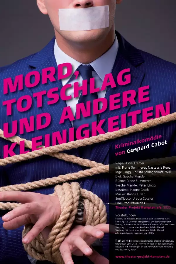Gleich weiter geht es am 13. und 14. Oktober 2023, jeweils um 19.00 Uhr, mit der Kriminalkomödie 'Mord, Totschlag und andere Kleinigkeiten', inszeniert vom Theater Projekt Kempten.